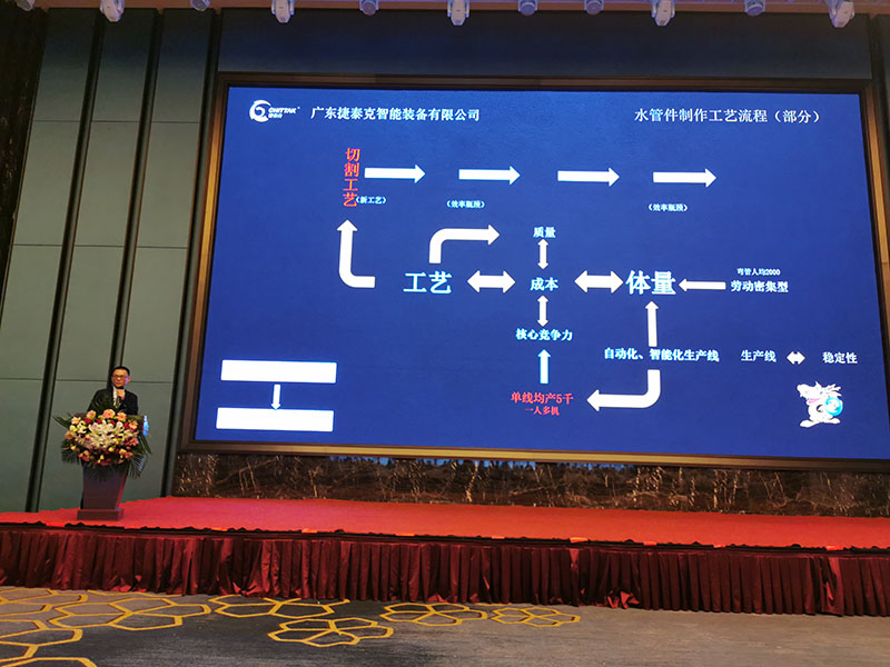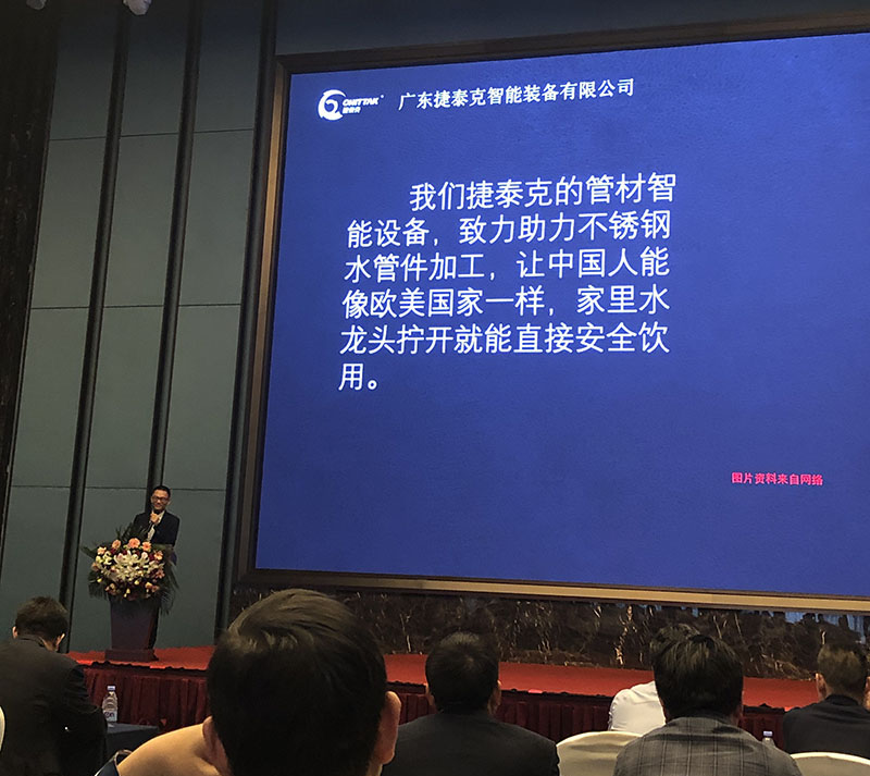 現(xiàn)場行業(yè)精英匯聚,共謀不銹鋼水管行業(yè)發(fā)展。會上我司黃董代表捷泰克上臺演講分享“捷泰克助力不銹鋼水管件加工智能化”,為不銹鋼水管件智能化、自動化生產提供解決方案。