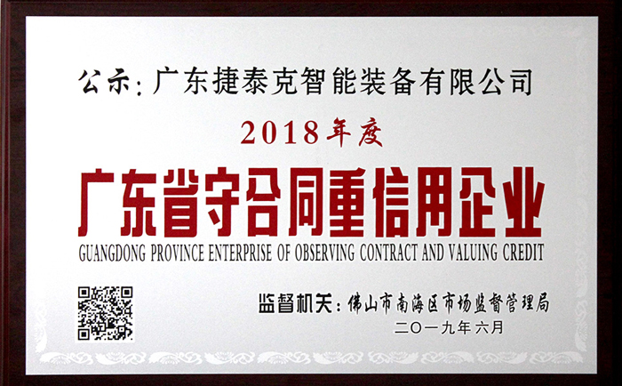 近年來,廣東捷泰克智能裝備有限公司堅持以誠信建設為基礎,全面打造誠信文化,在經營管理中,重視企業(yè)信譽,恪守誠信經營,嚴格合同管理,狠抓經營和管理工作,主動履行企業(yè)社會責任,廣受社會各界好評!